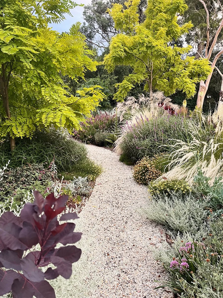 A naturalistic, tranquil cottage garden in a rural pastural setting with glimpses of Western Port Bay and Seal Rocks.