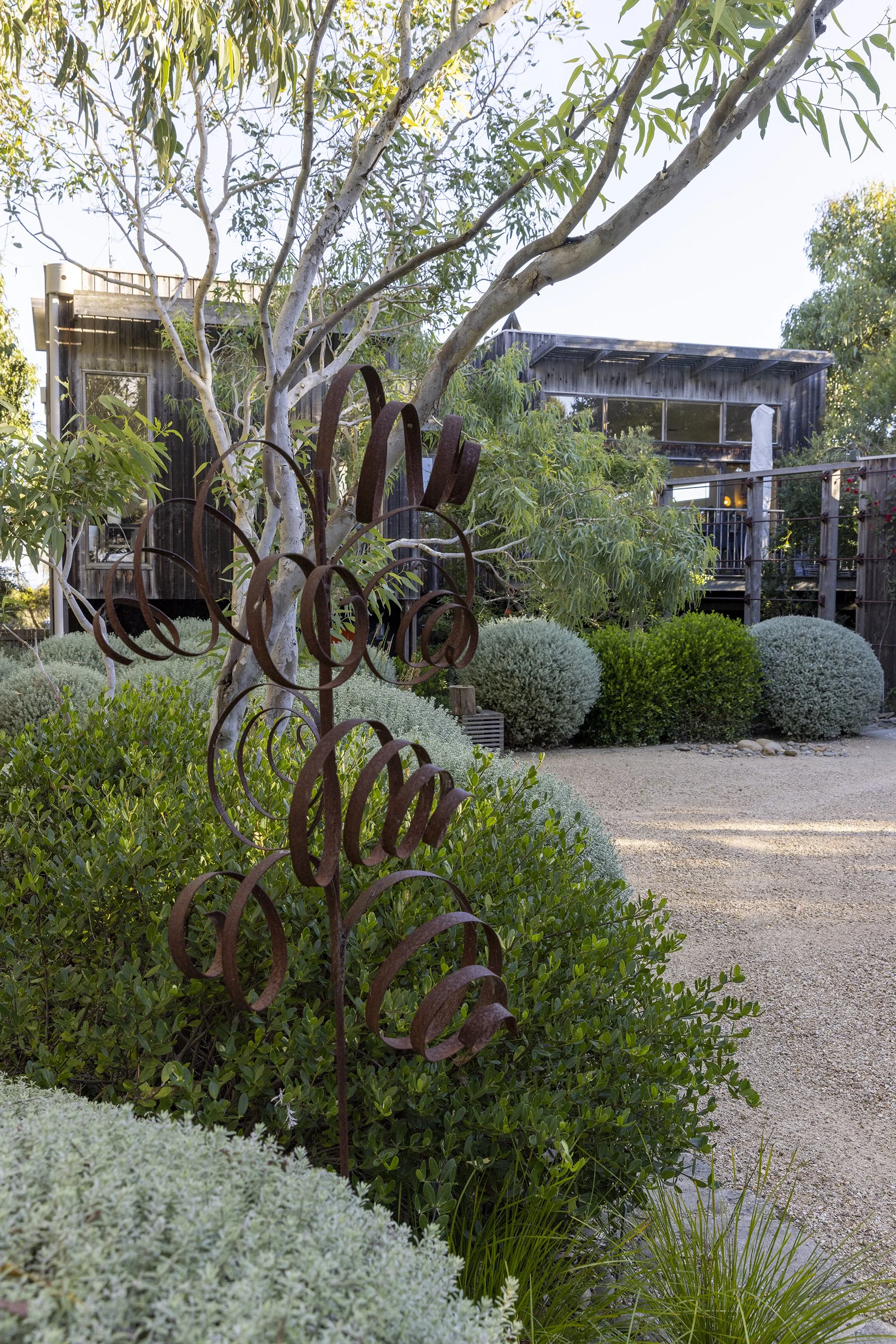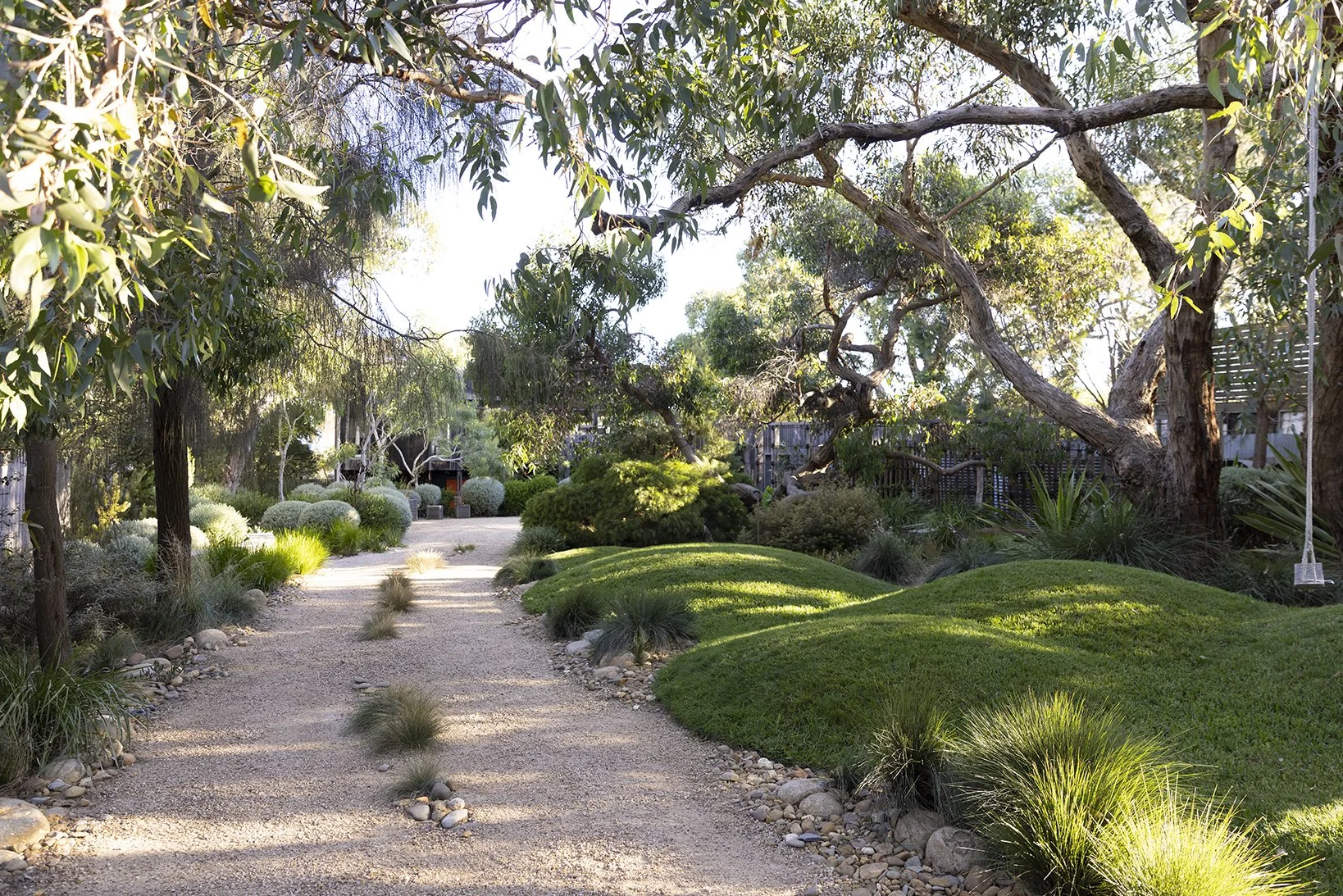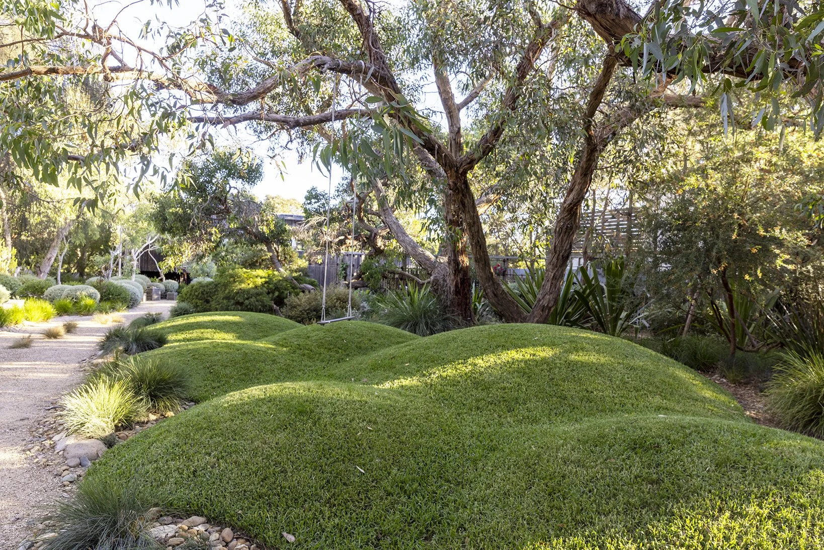 The house is purposefully sited to the rear enabling sculptural messmate gums to spread their branches wide. An interesting feature are the grassy knowls formed from random undulating mounds, they add flair by playing with a green element that under ordinary conditions would have been ‘just another green lawn’.