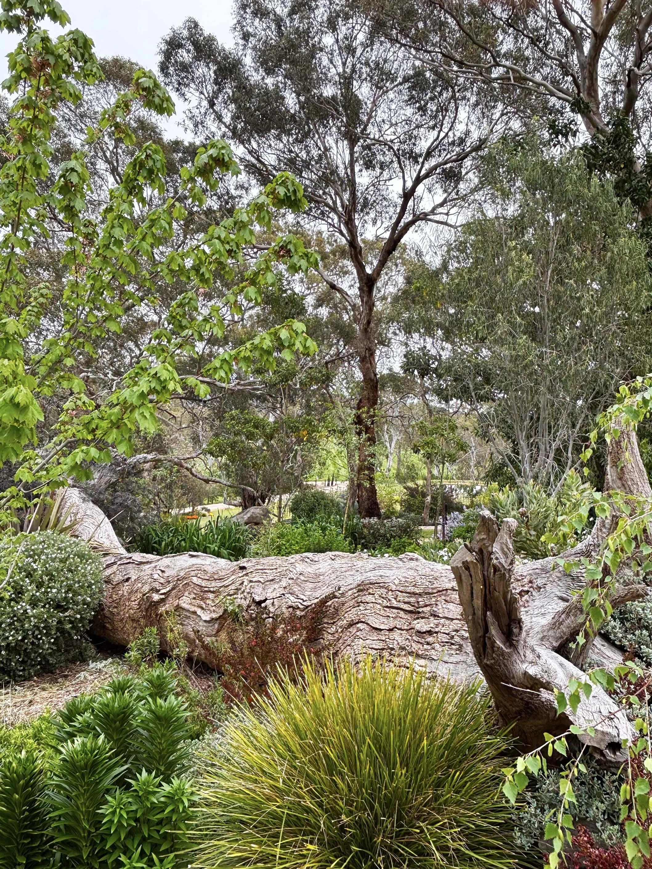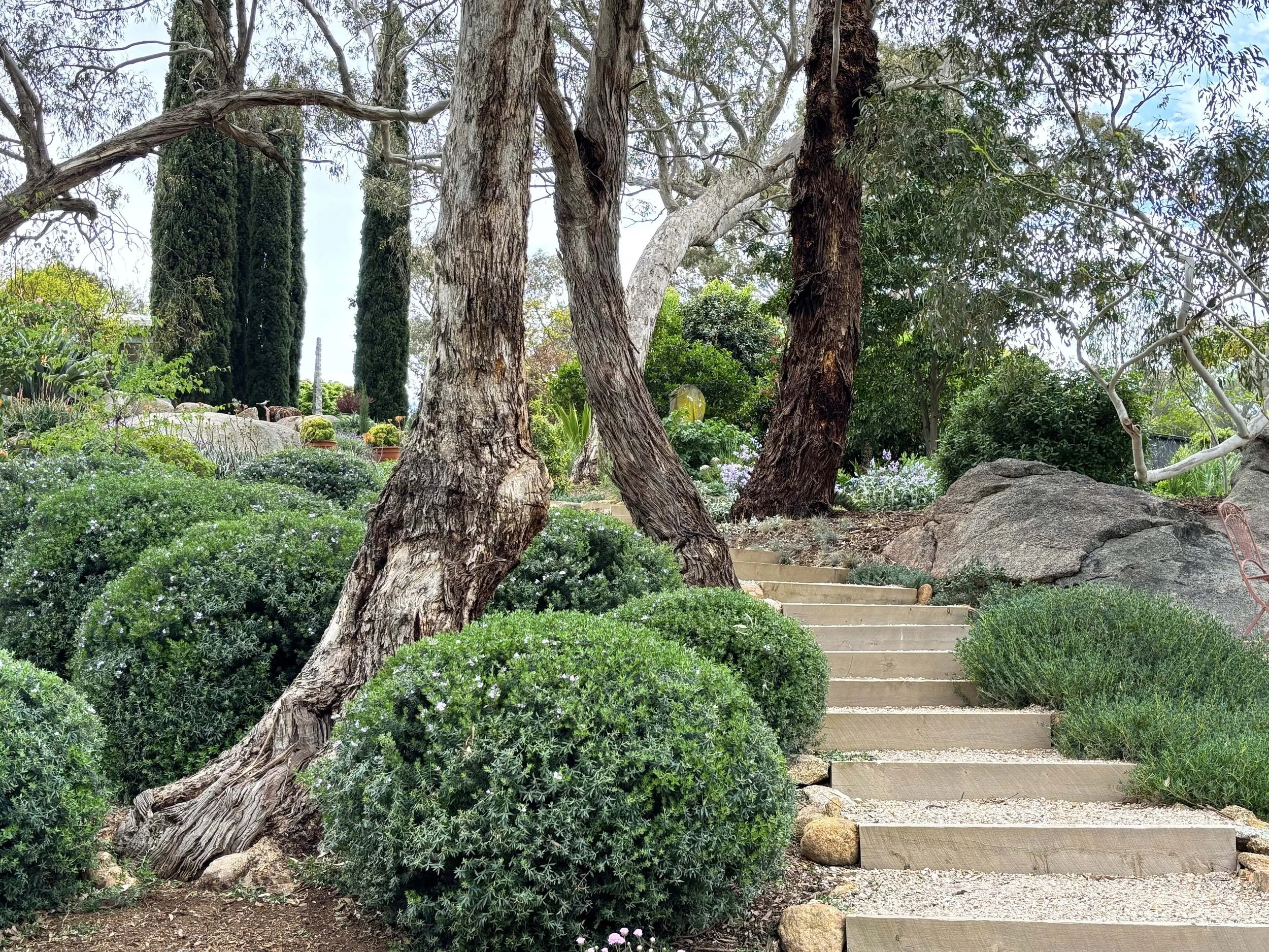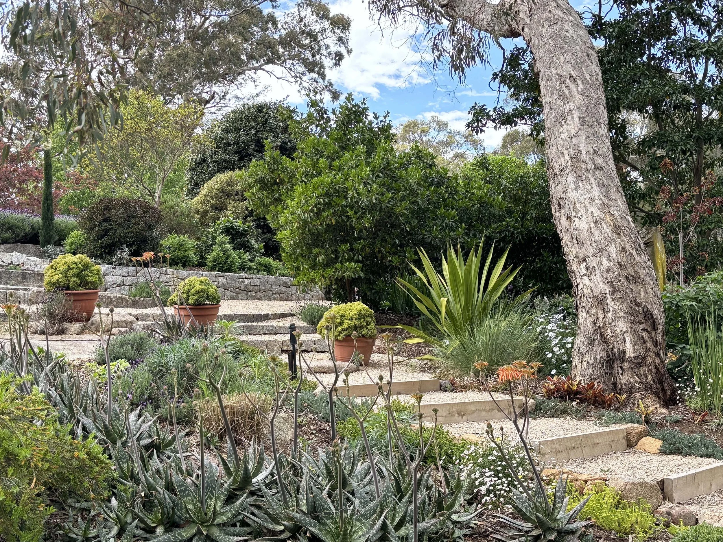 Since the garden is hilly and has several old gums and exotics, the planting ranges from large border plantings, shade area plantings like Hydrangeas and drought tolerant plants in more open areas.