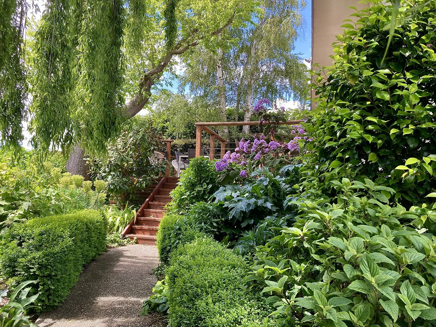 This beautifully cared for garden has evolved over that time without any professional planning. Marg is a passionate plantswoman and over the 25 years she has adapted the planting as the garden has become shader and different plants have earned their place. Some of Marg’s favourites are the Camillia sasanquahedge, the perennial beds including David Austin roses that line the small driveway, the Jacaranda particularly in the summer and the hellebores and camellias in the winter. The New Zealand Rock Lily, Anthropodium cirratum and other shade loving perennials, have been trialled and used extensively throughout the garden providing a solution to many challenges of the site.