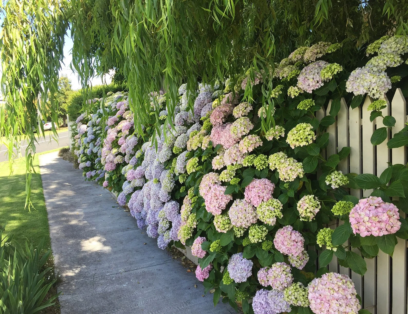 The mass planting of hydrangeas attracts a lot of interest throughout the seasons as they tumble through the picket fence and provide splashes of warmth throughout the garden.
