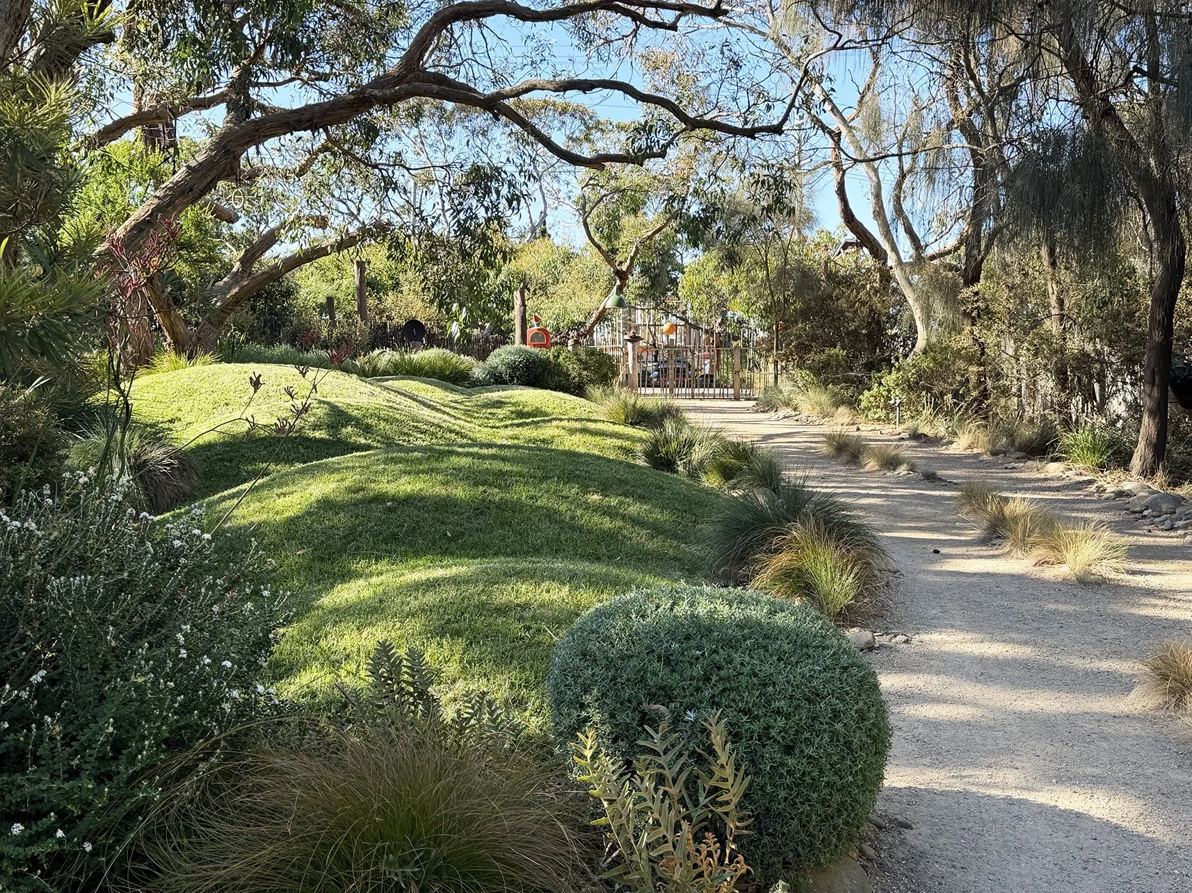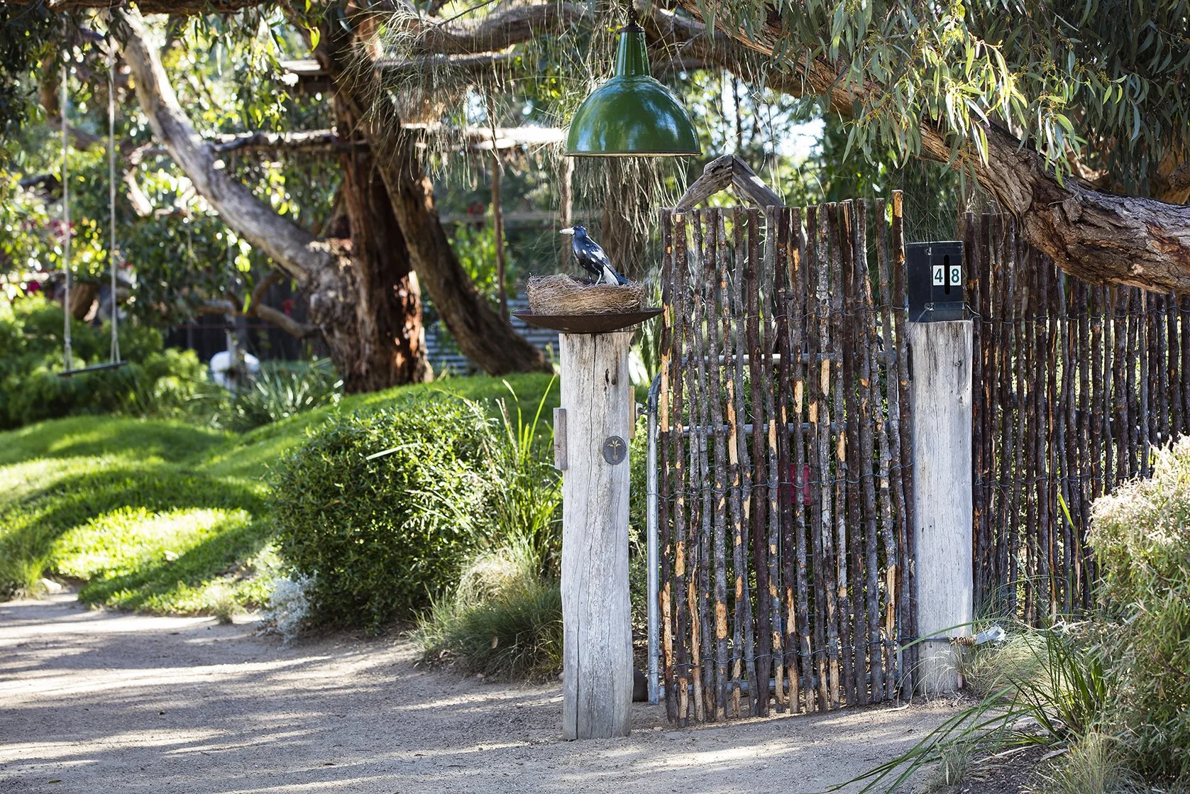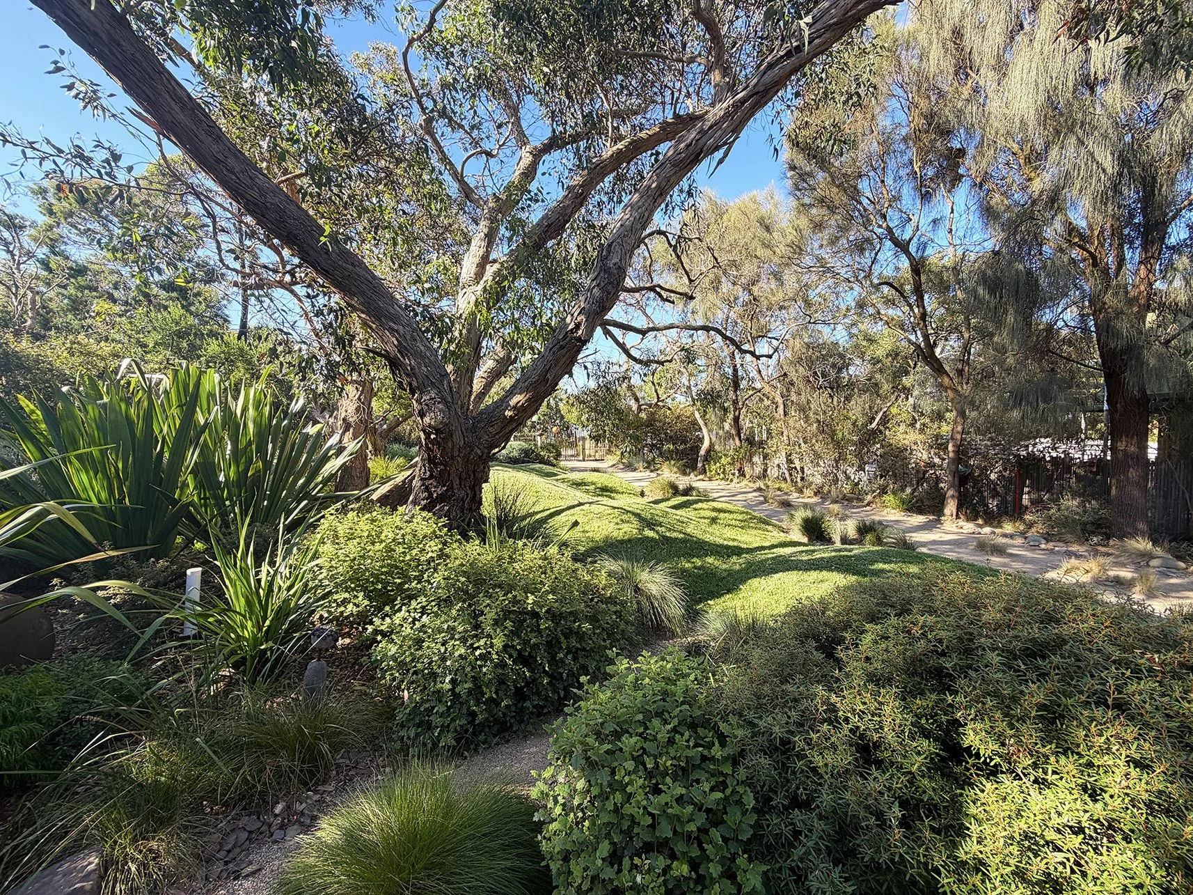The house is purposefully sited to the rear enabling sculptural messmate gums to spread their branches wide. An interesting feature are the grassy knowls formed from random undulating mounds, they add flair by playing with a green element that under ordinary conditions would have been ‘just another green lawn’.