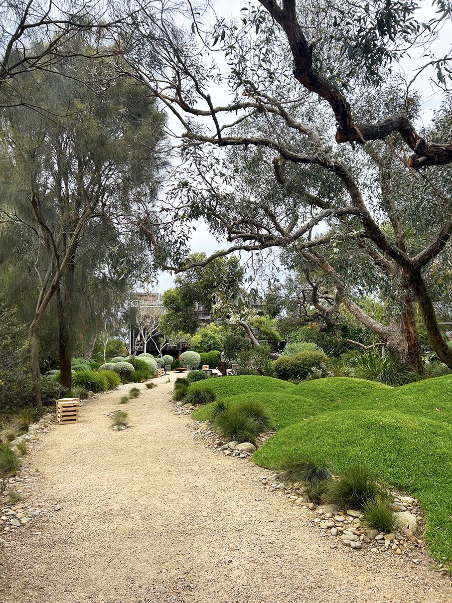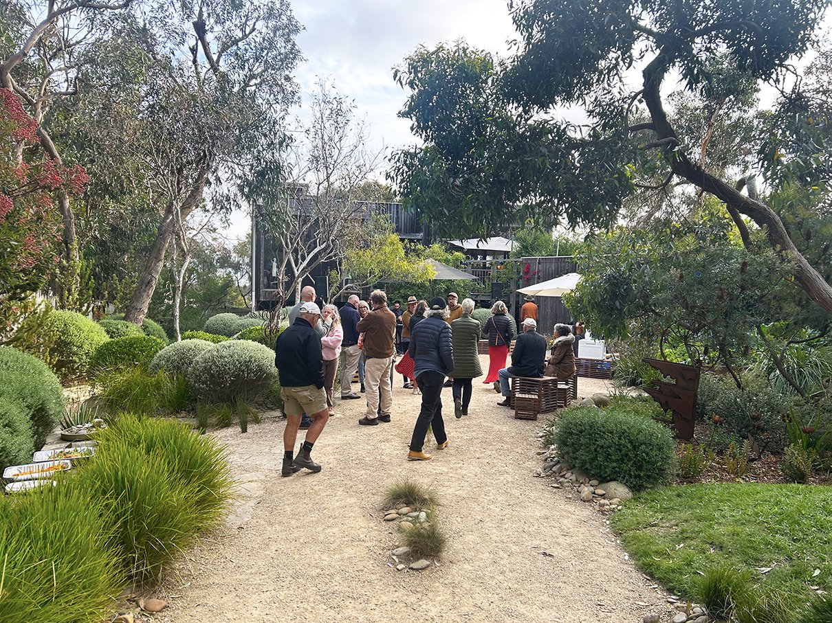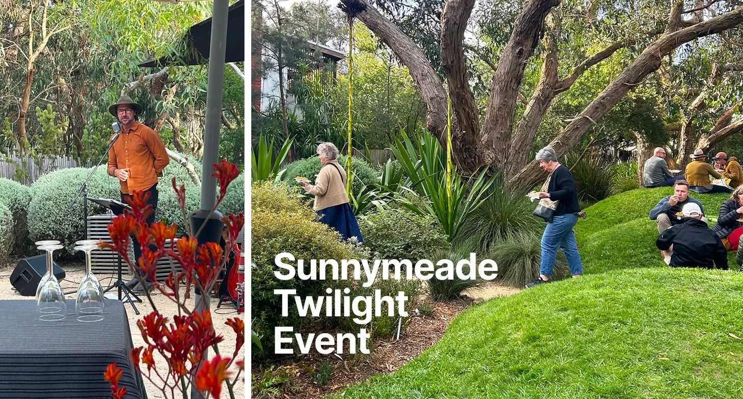 Enjoy a more intimate twilight experience in Peter and Simone Shaw’s garden, Sunnymeade—a coastal Anglesea landscape known for its sculptural messmate gums, sweeping grassy mounds, and carefully curated native plantings that sit gently within the surrounding bushland.